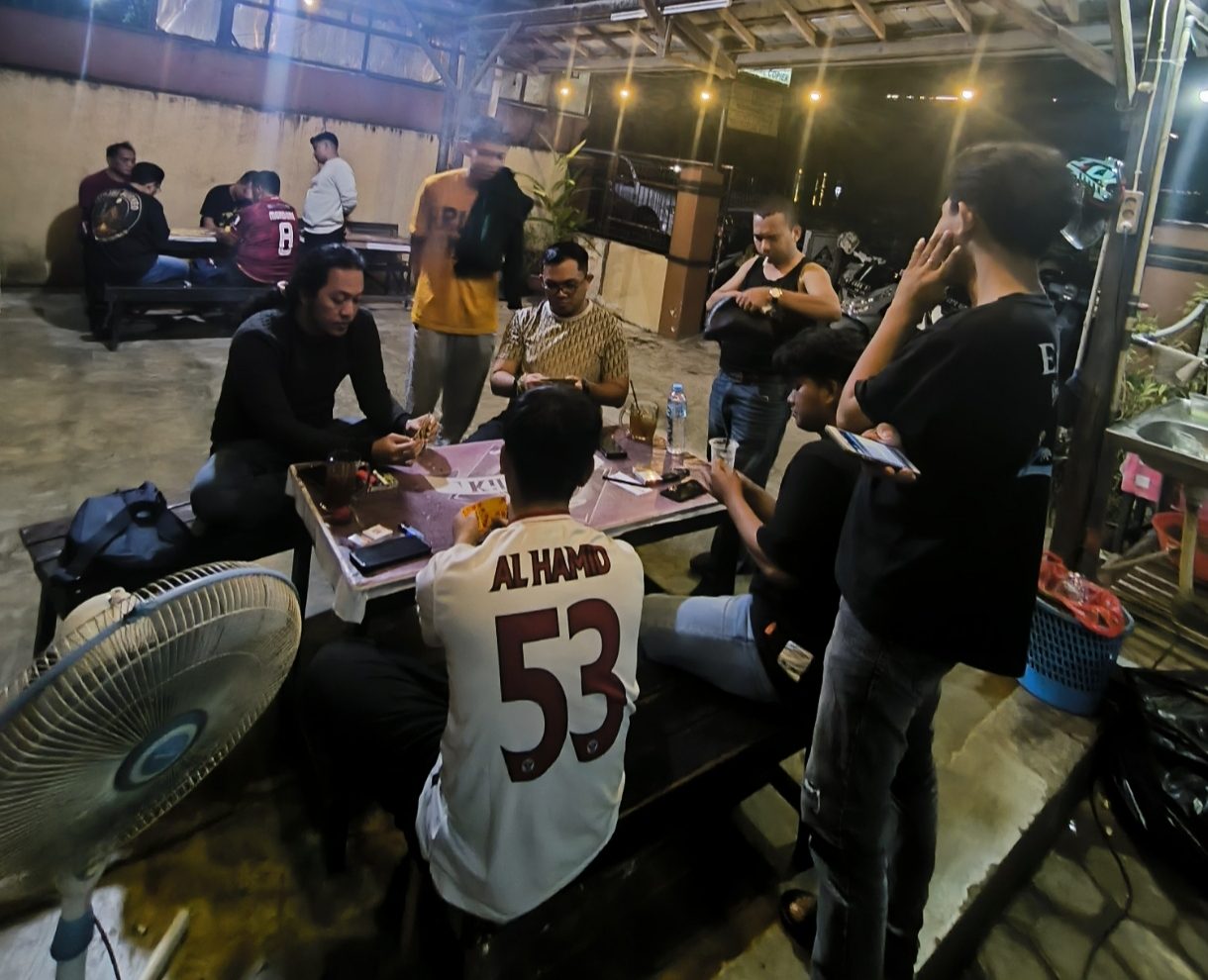 Saat malam turun, Kopi Balik berubah total. Layanan fotokopi yang berjalan sepanjang siang berhenti, kemudian tempat ini berganti fungsi menjadi ruang nongkrong yang hidup. Pencahayaan kuning dari bohlam gantung langsung menciptakan suasana hangat. Selain itu, area terbuka mulai dipenuhi pengunjung yang datang dengan berbagai tujuan.