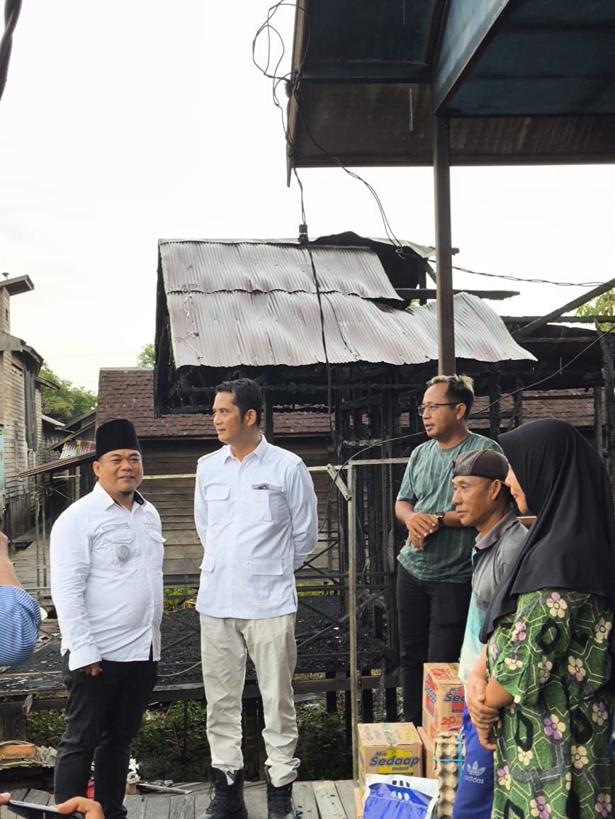 Di lokasi kejadian Hendra memberikan bantuan langsung paket sembako berubah beras, telur dan mie instant dan berdialog dengan warga setempat.